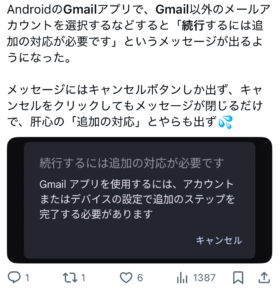 Gmailアプリで【続行するには追加の対応が必要です】と表示されると話題