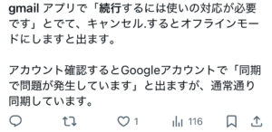 2025年10月3日現在、Gmailアプリで【続行するには追加の対応が必要ですGmail アプリを使用するには、アカウントまたはデバイスの設定で追加のステップを完了する必要があります】というポップアップが今日突然出るようになったとの報告がなされています。