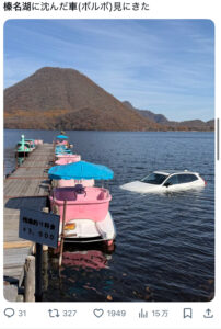 群馬県の人気観光地・榛名湖に半分沈んだ車(ボルボ)があるとSNS上で話題になっています。