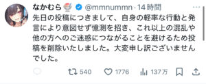 なかむらさんはその後、混乱を招いたことを謝罪し投稿を削除しています。