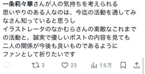 一条莉々華さんと絵師なかむらさんの和解を望む声が多くありました。