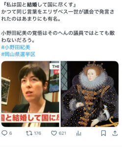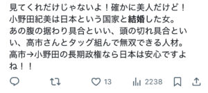 世間では「私は国と結婚して尽くす」という小野田紀美さんの言葉に感銘を受けたという声が多く見られます。