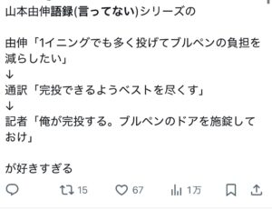 その結果、SNSでは「実際は言ってないのに語録ができている!」と話題になり、『山本由伸 言ってない語録』というネット文化が誕生しました。